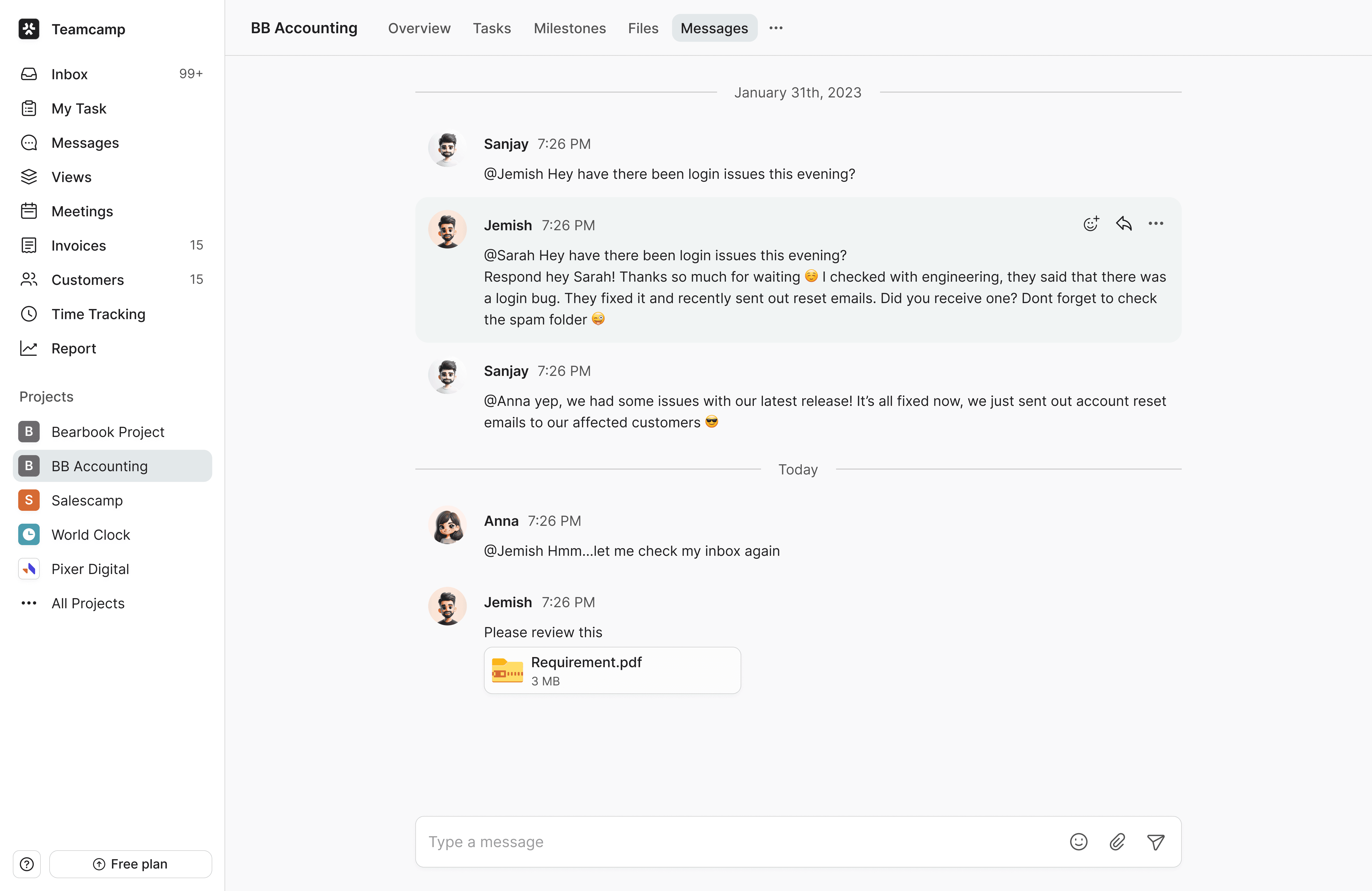 Each project has its own dedicated message space where the team can share updates and discuss work collaboratively.