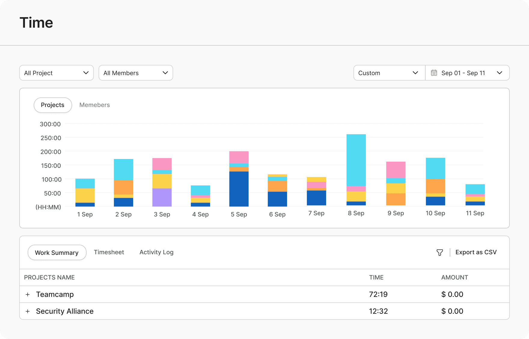 List all the time you and your team spent on a project.